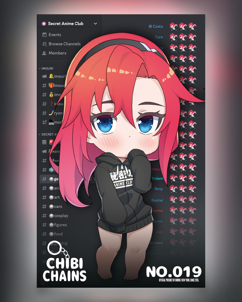 Chibi Chains! Our collectible limited production run of anime oc keychains that feature a uniquely themed artwork of Imouri-Chan released every month. This listing is for: Number 19, "Secret Anime Club". Imouri-Chan is a part of the Secret Anime Club. Are you?