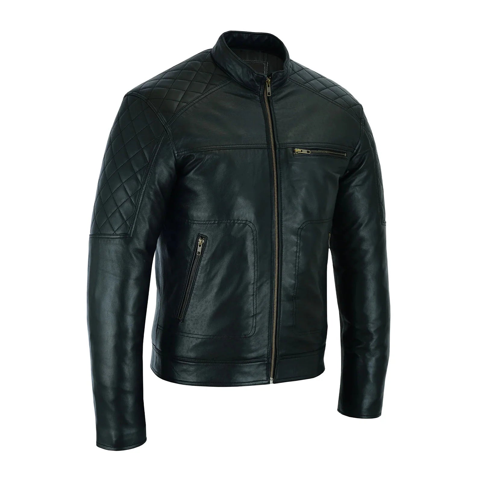 Designed for bikers, the Leatherick Men's Vintage Biker Jacket combines style, comfort, and durability. Crafted from genuine 0.8mm sheep leather, it features unique stitching on the shoulders and arms, offering a sleek, retro look. The soft, non-allergenic inner liner ensures comfort on long rides, while double-stitched seams and rust-resistant zippers provide durability. With 5 pockets for practicality, this slim-fit jacket is perfect for outdoor activities and summer rides.